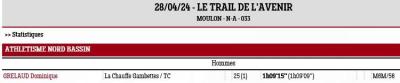 avait lieu à Moulon le Trail de l'Avenir, en réalité 2 trails dont la Chauffe Gambettes, 11km, 250 D+, entre vignes, forêts et passages boueux, à laquelle participait Dominique GRELAUD.
